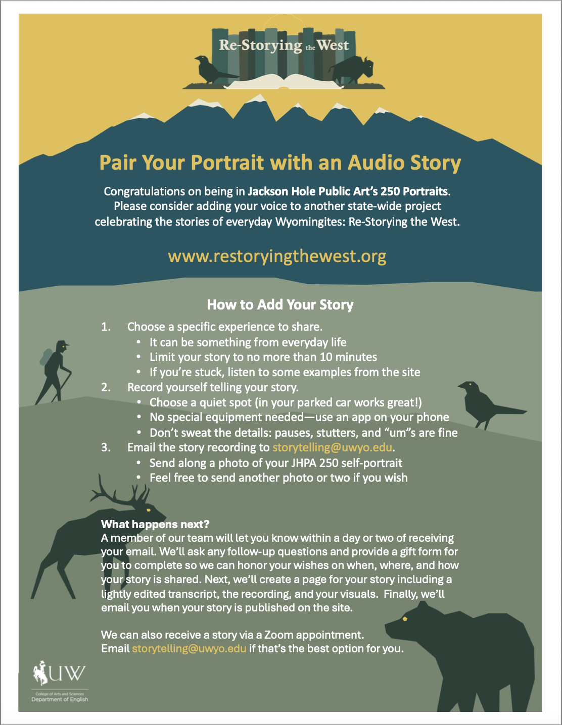 250 Portraits invites Wyoming residents of all ages to create self-portraits using a limited color palette. The portraits will be displayed in five grids of fifty throughout downtown Jackson during the nation’s 250th anniversary year. The project highlights individual identity and collective belonging across Wyoming’s communities, supported by a self-guided walking map and opportunities for other towns to host their own installations (digital files and wheatpasting How-To provided by JHPA).